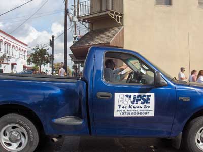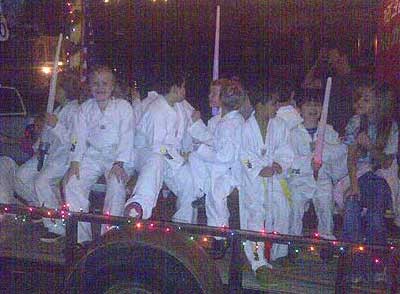 Marching down main street.